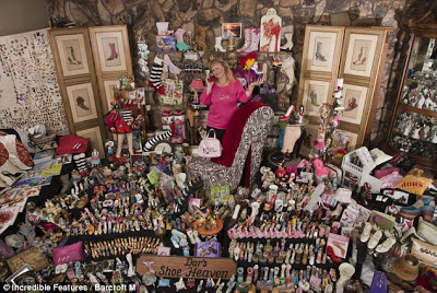 There was a bird house made out of a boot hanging from the eaves, and decorative shoes in her yard and filling her garage.